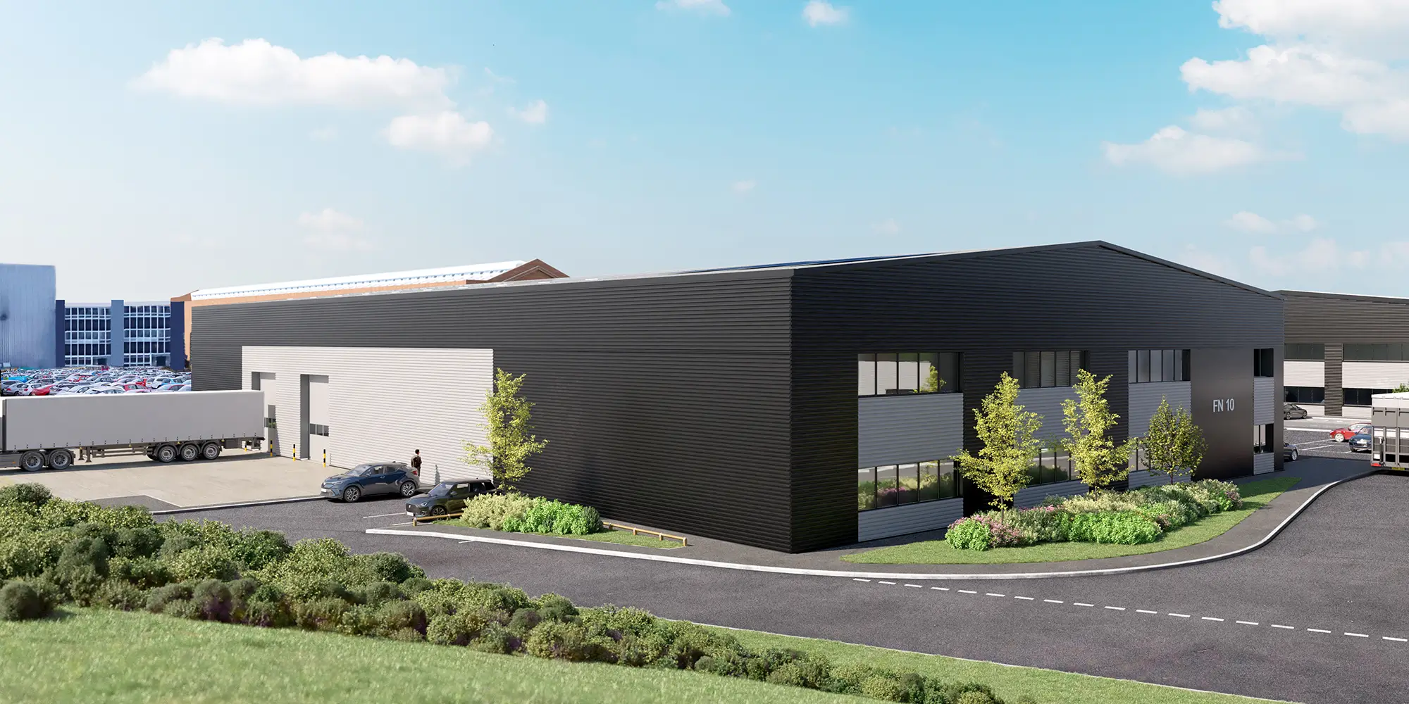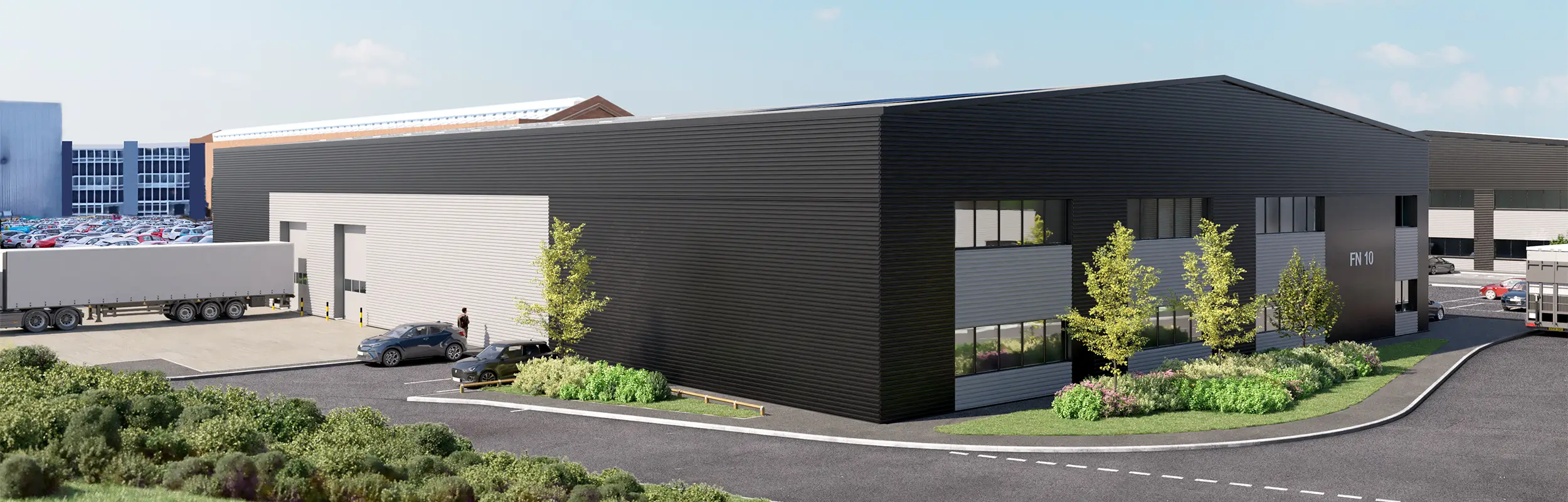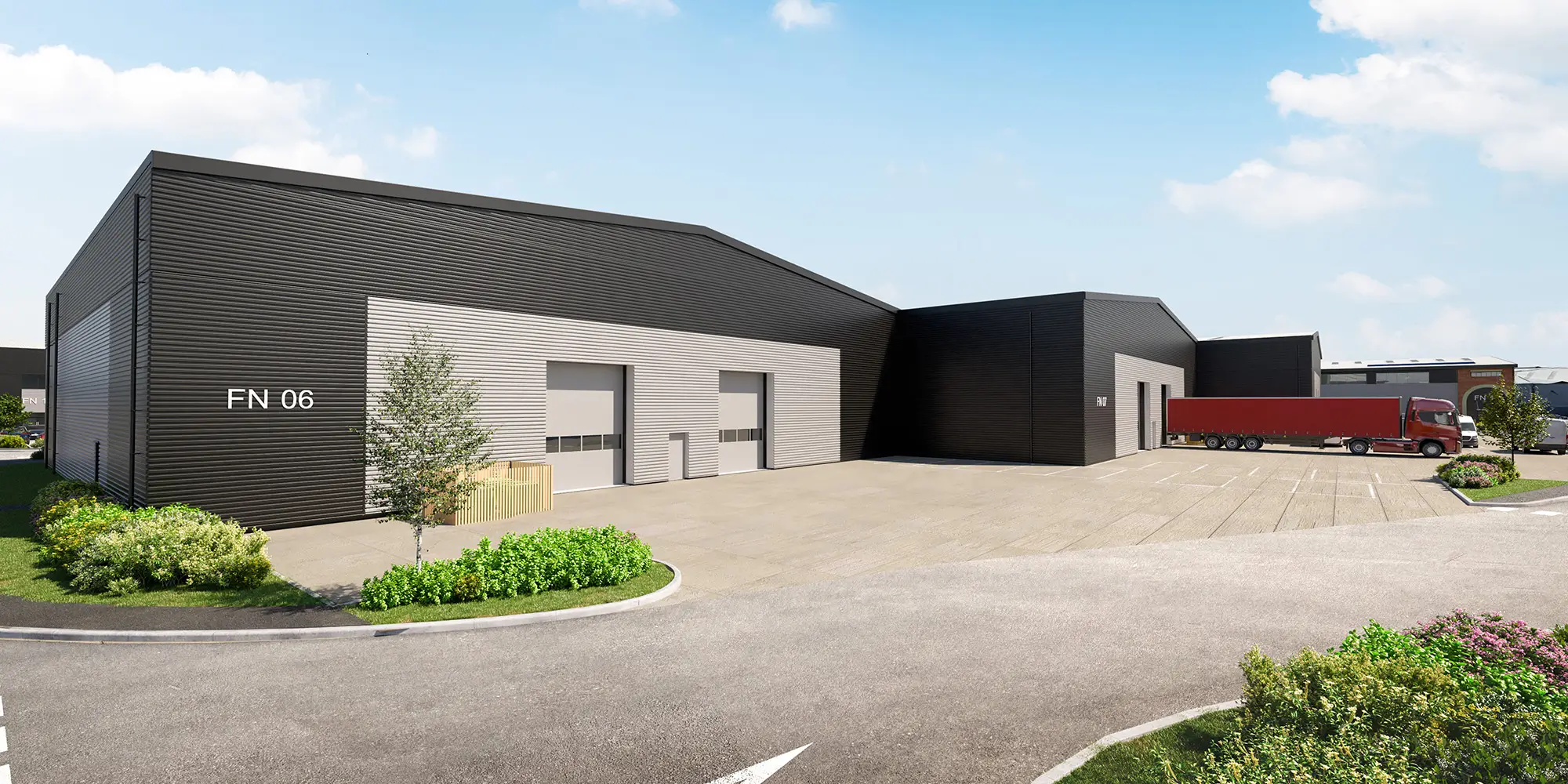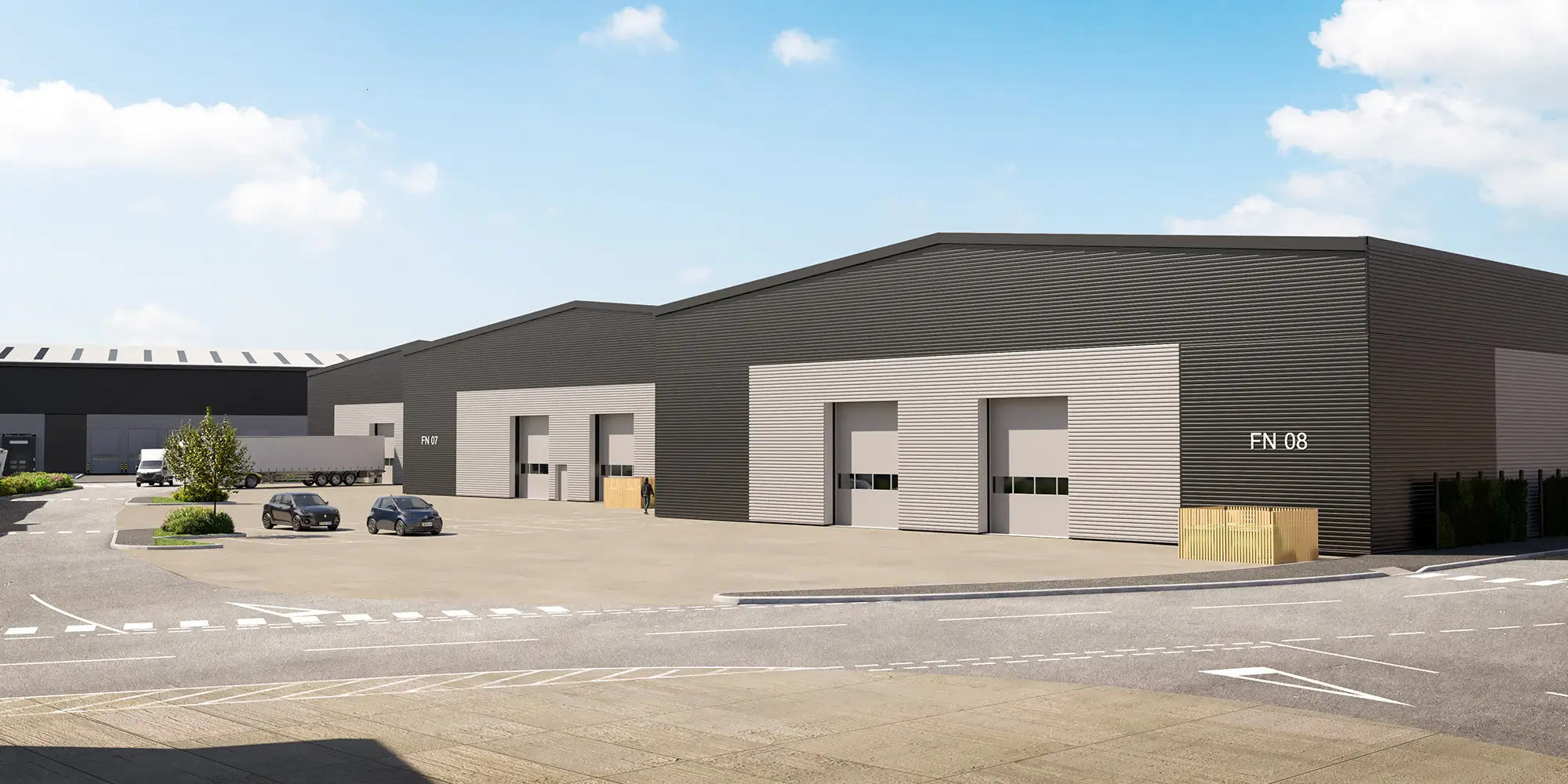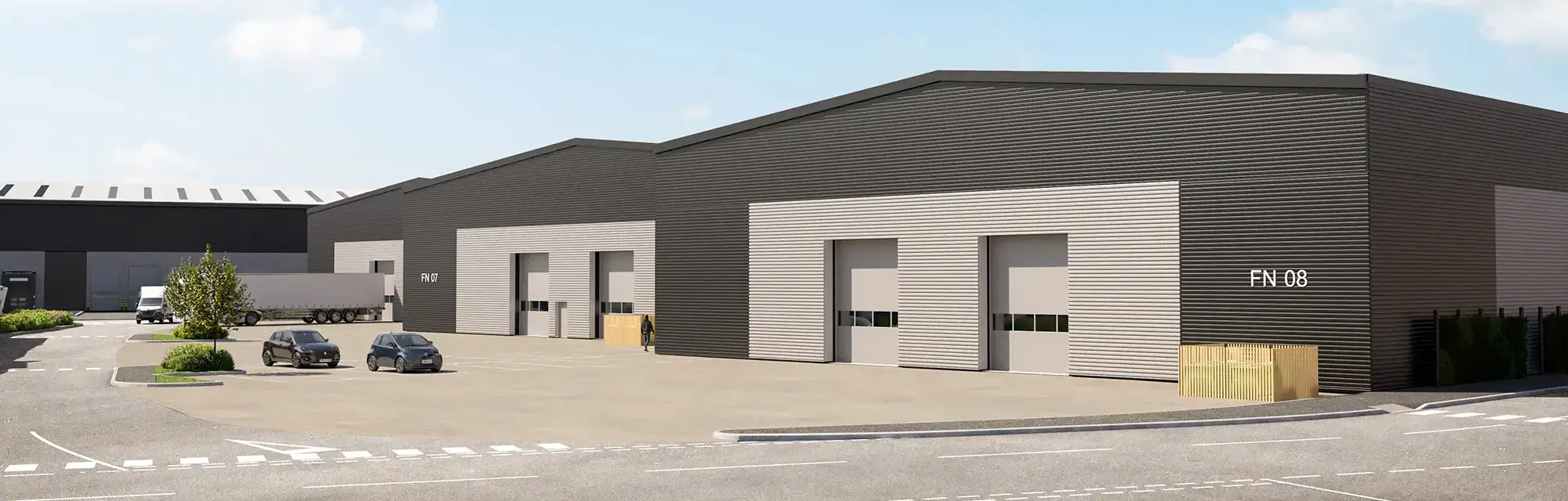 Service yards for the units will be accessible via internal access roads. The depths of these yards will vary between 20 and 25 metres, accommodating a wide range of vehicle fleets and meeting the needs of various end users. Parking facilities for visitors, staff, and cyclists will be located in close proximity to the primary office entrances of each unit.